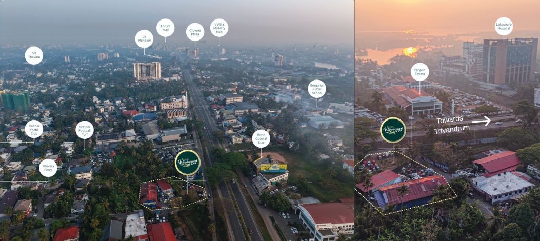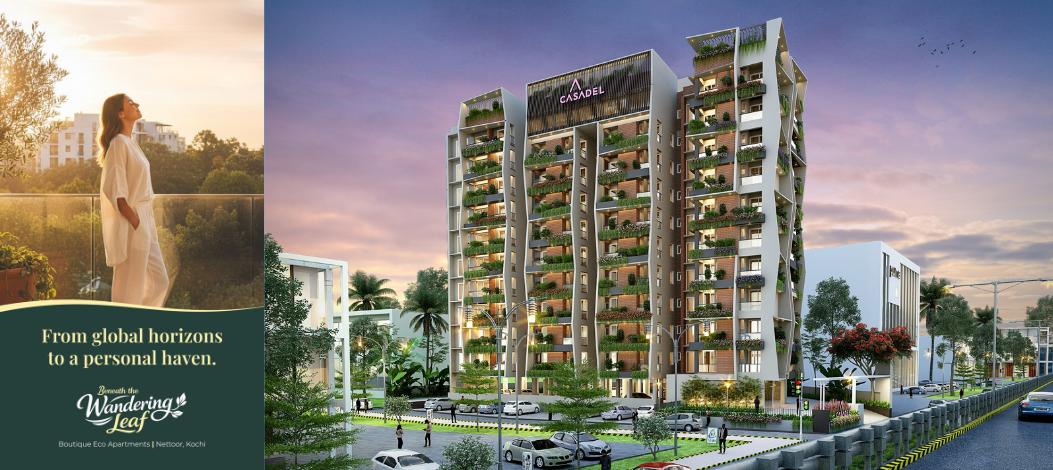 "Beneath the Wandering Leaf" - featuring Eco-conscious lifestyle for people who love travel. A landmark apartment surrounded by greenery and facing NH66 between Forum Mall & Lakeshore Hospital, near the upcoming Nettoor–Angamaly Bypass. It offers spacious 2 & 3 BHK apartments with 40+ premium amenities, within a secure, serene address—one that inspires you to travel, to explore, and to embrace a deeper understanding of the world, before welcoming you back, every time. Spacious layouts with sky garden and balcony for every bedroom.