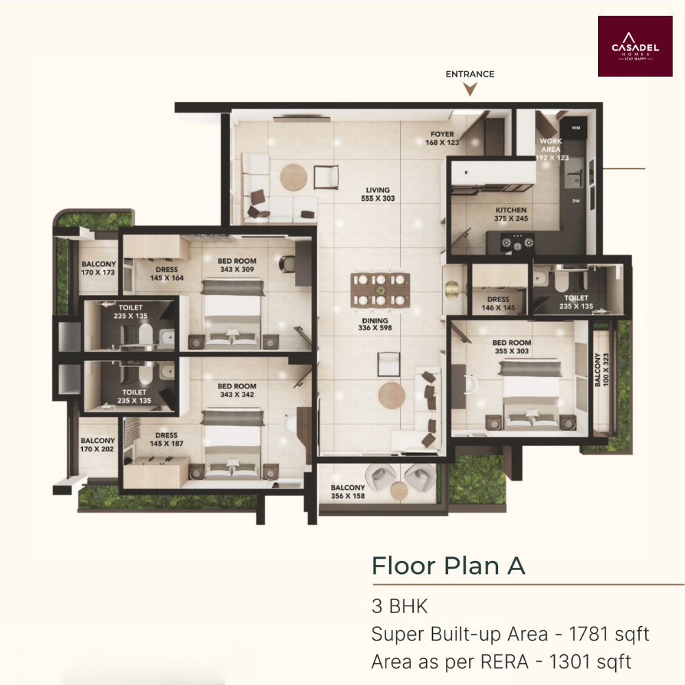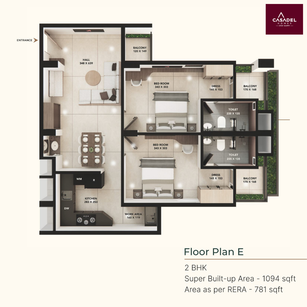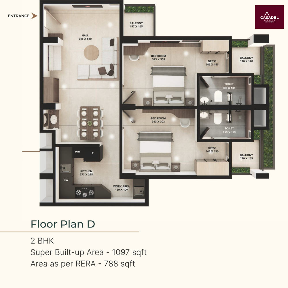 Elegant 120 x 180 vitrified tiles in living, dining, bedrooms, and kitchen. Anti-skid tiles in bathrooms.