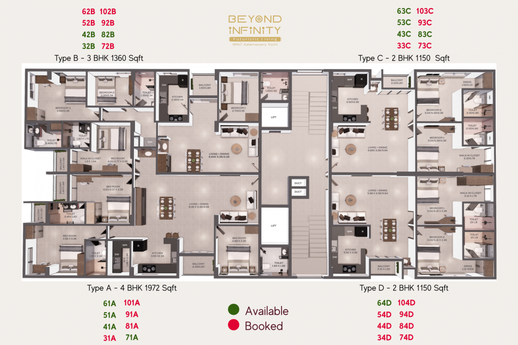 Located at Kalamassery, Kochi, this iconic address faces National Highway 47 and is just steps away from the CUSAT Metro Station, offering unmatched urban connectivity. Featuring 2, 3, and 4 BHK apartments and 20+ world-class amenities, BEYOND INFINITY marks a bold leap into the future—where smart living blends seamlessly with futuristic design.
